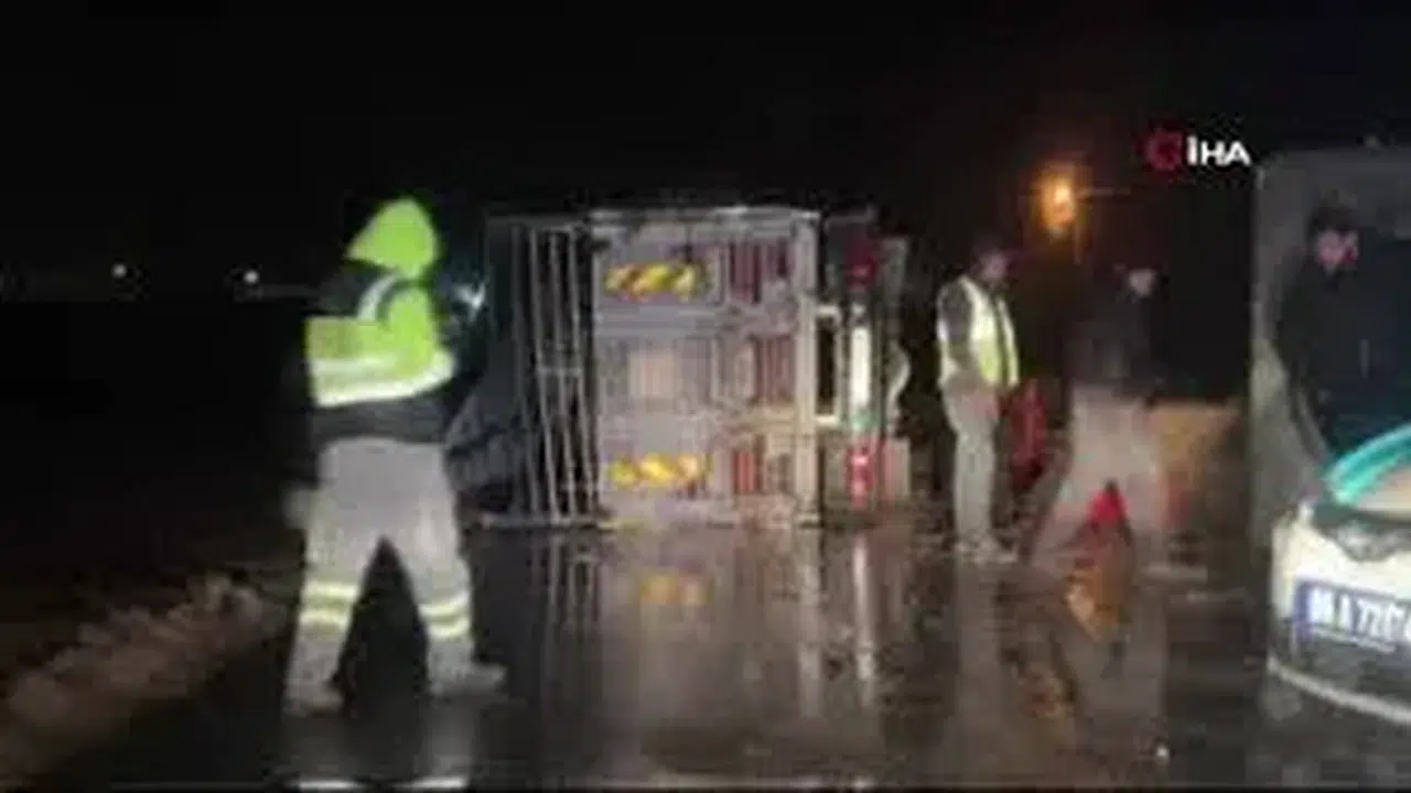 06 BCD 630 plakalı kamyonun sürücüsü, etkili yağış nedeniyle kayganlaşan yolda direksiyon hâkimiyetini kaybedince araç kontrolden çıkarak devrildi. Kazada kamyondaki çok sayıda küçükbaş hayvan telef olurken, sürücünün hafif yaralandığı öğrenildi.