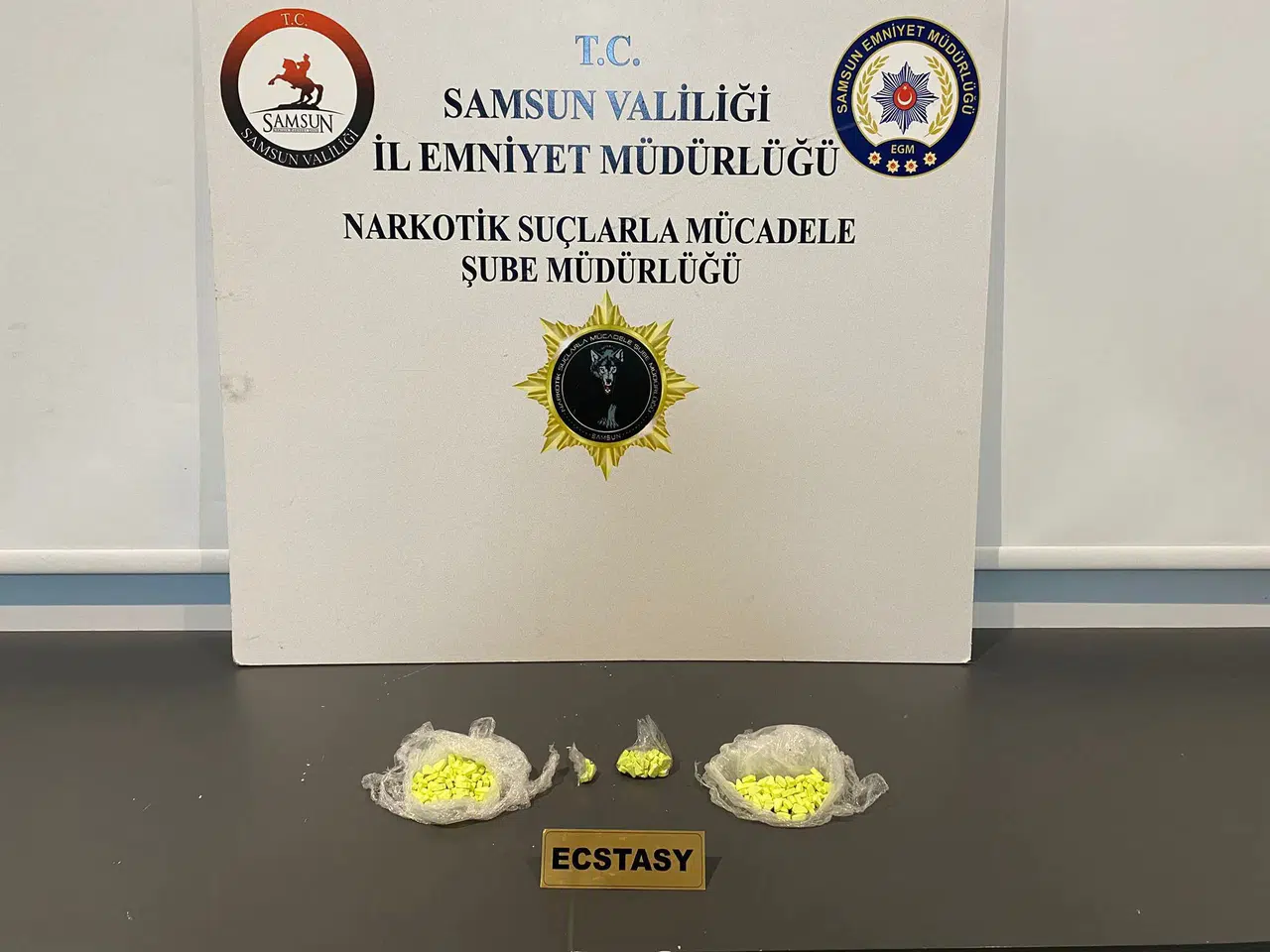 Samsun'da narkotik ekiplerince düzenlenen operasyonda bir ikamette yapılan aramada 208 adet ecstasy hap ele geçirilirken, 1 şüpheli gözaltına alındı. Samsun İl Emniyet Müdürlüğü Narkotik Suçlarla Mücadele Şube Müdürlüğü ekipleri, uyuşturucu madde ticaretinin önlenmesine yönelik yürüttüğü çalışmalar kapsamında İlkadım ilçesinde bir adrese operasyon düzenledi. Operasyonda D.G. (20) isimli şüpheli yakalanarak gözaltına alındı. Şüphelinin ikametinde yapılan aramada 208 adet ecstasy hap ele geçirildi. Olayla ilgili şüpheli hakkında 'uyuşturucu madde ticareti yapmak' suçundan adli işlem başlatıldı.