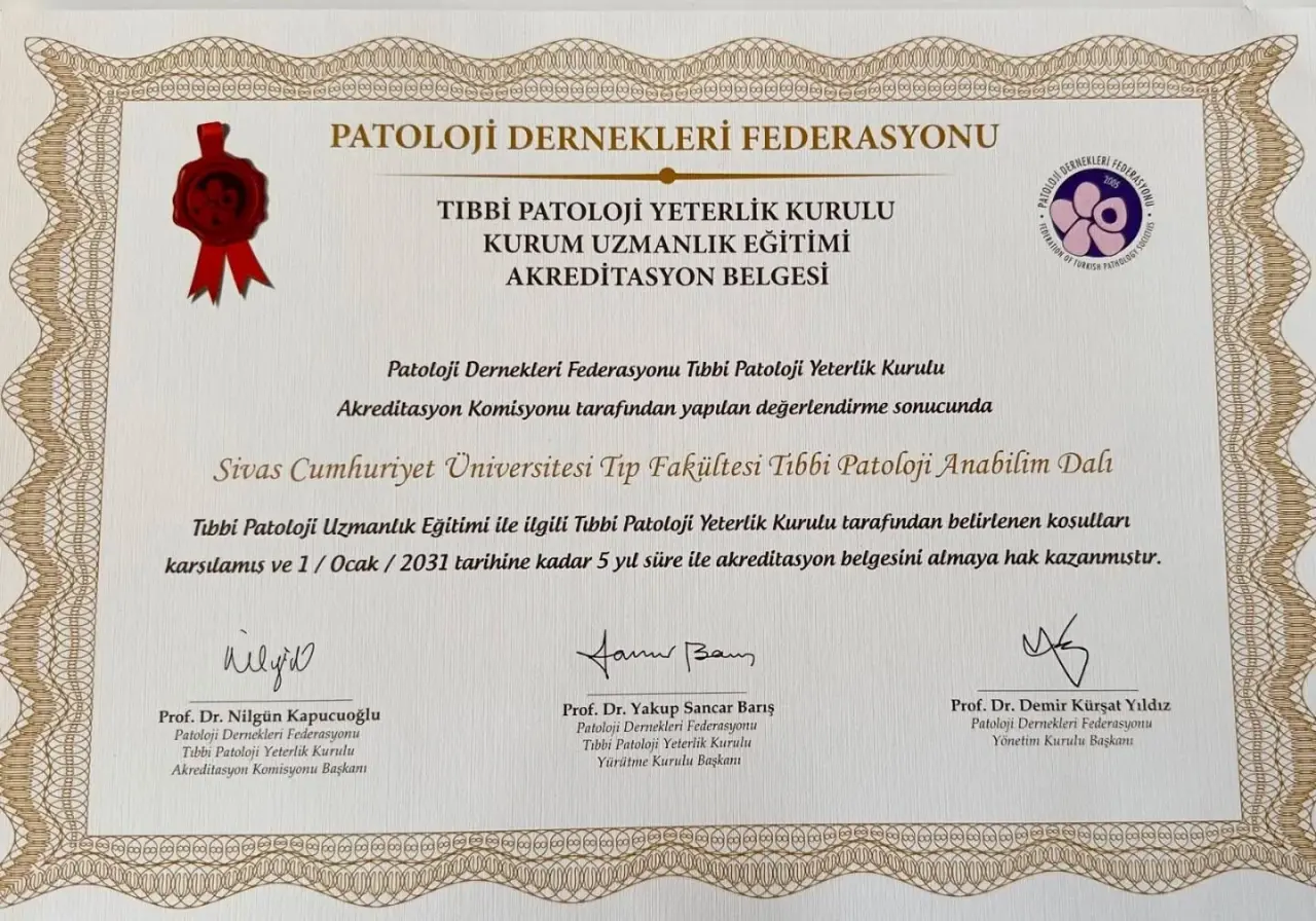 Sivas Cumhuriyet Üniversitesi Tıp Fakültesi Tıbbi Patoloji Ana Bilim Dalı, Patoloji Dernekleri Federasyonu Tıbbi Patoloji Yeterlik Kurulu tarafından yapılan değerlendirme sonucunda yeniden akredite edildi. Akreditasyon belgesi, düzenlenen törenle Ana Bilim Dalı’na resmî olarak takdim edildi.