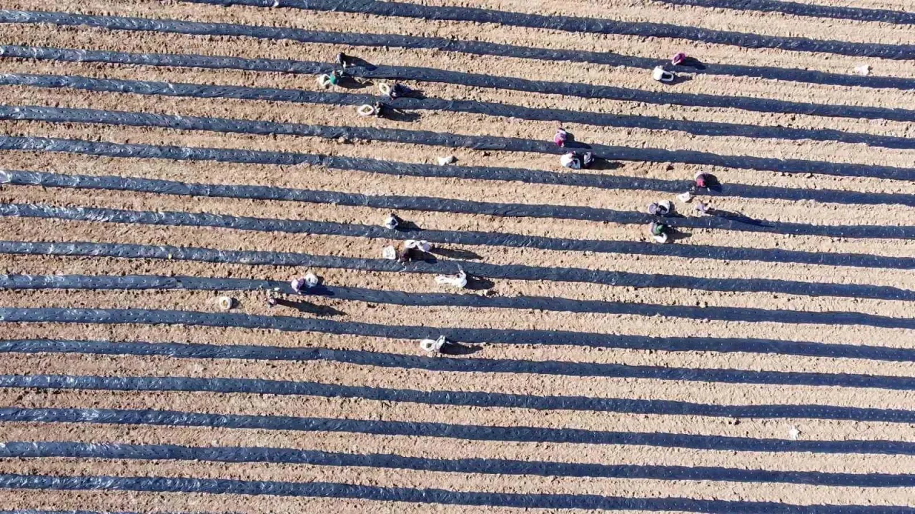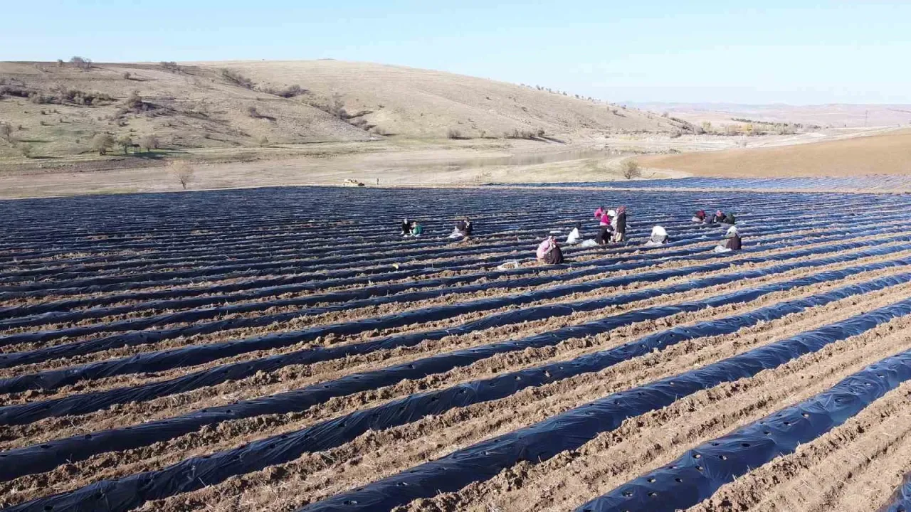 İlk mahsulün 2026 yılının Nisan ayında alınması planlanıyor. Şu günlerde çevre köylerden gelen kadınlar, tarlada fidelerin köklerini temizleyerek toprakla buluşturuyor.