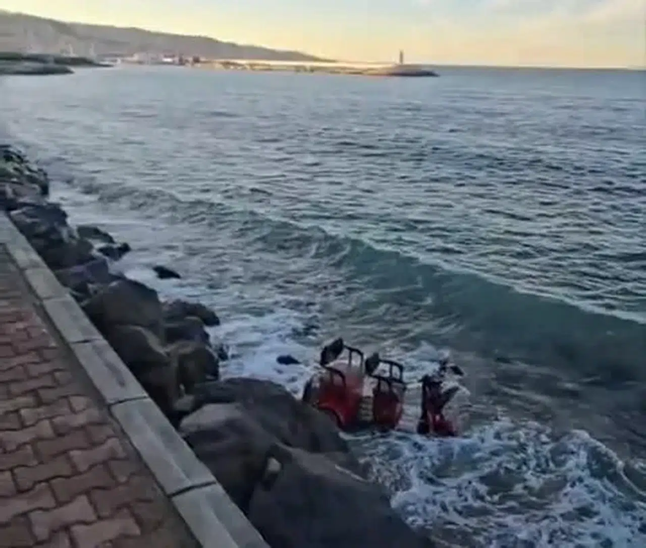 Alınan bilgiye göre, içerisinde iki kişinin bulunduğu 3 tekerlekli motosiklet; sürücüsünün direksiyon hakimiyetini kaybetmesi sonucu yaklaşık 3 metre yükseklikten önce kayalıkların üzerine düştü, ardından denize savruldu.