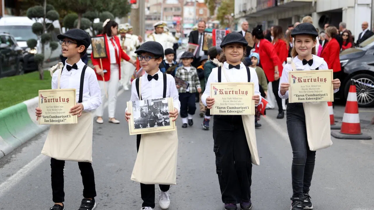 Kırklareli'nde, Cumhuriyet'in 102. yıl dönümü etkinlikleri kapsamında "Yarın Cumhuriyeti ilan edeceğiz" manşetiyle basılan temsili gazete dağıtıldı.