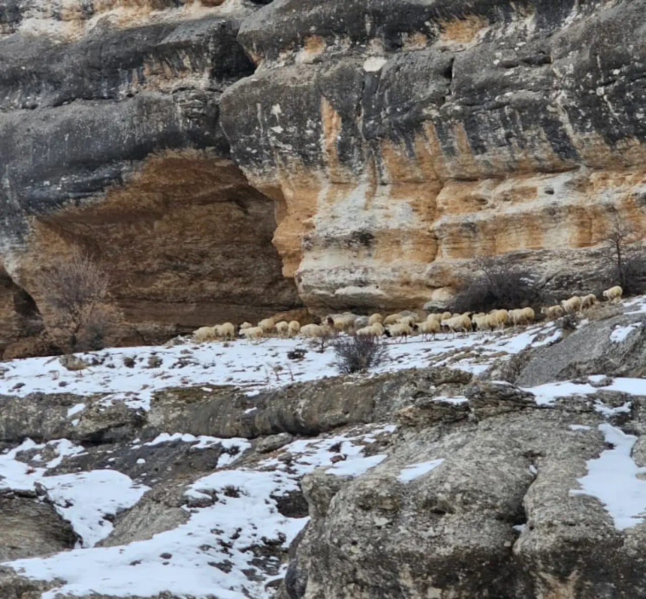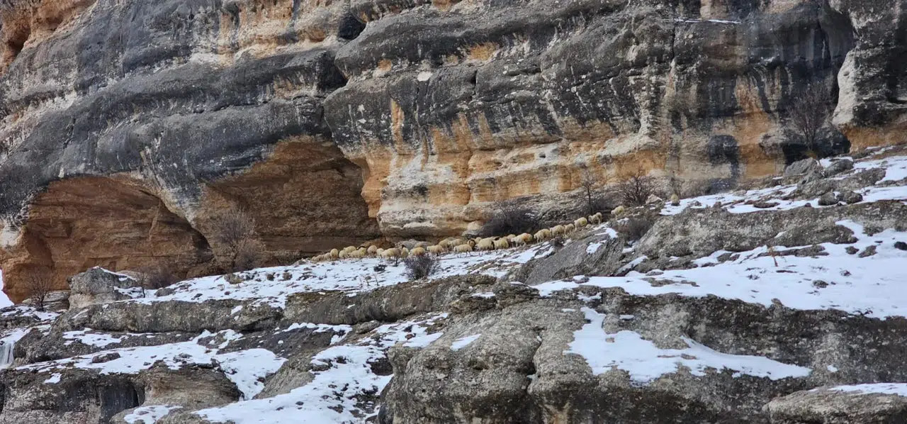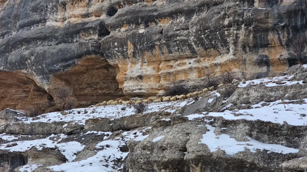 Kentte yoğun kar yağışına rağmen ahırlardan çıkarılan sürüler, zorlu arazi şartlarında yemleniyor. Karla kaplı yüksek kayalıklara götürülen hayvanların yolculuğu cep telefonu kamerasıyla görüntülendi.
