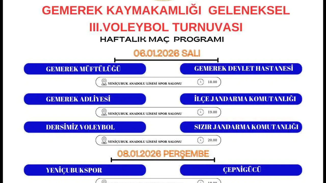 Gemerek Kaymakamlığı tarafından düzenlenen 3. Geleneksel Kurumlararası Voleybol Turnuvası, bugün 06.01.2025 tarihinde başlıyor.