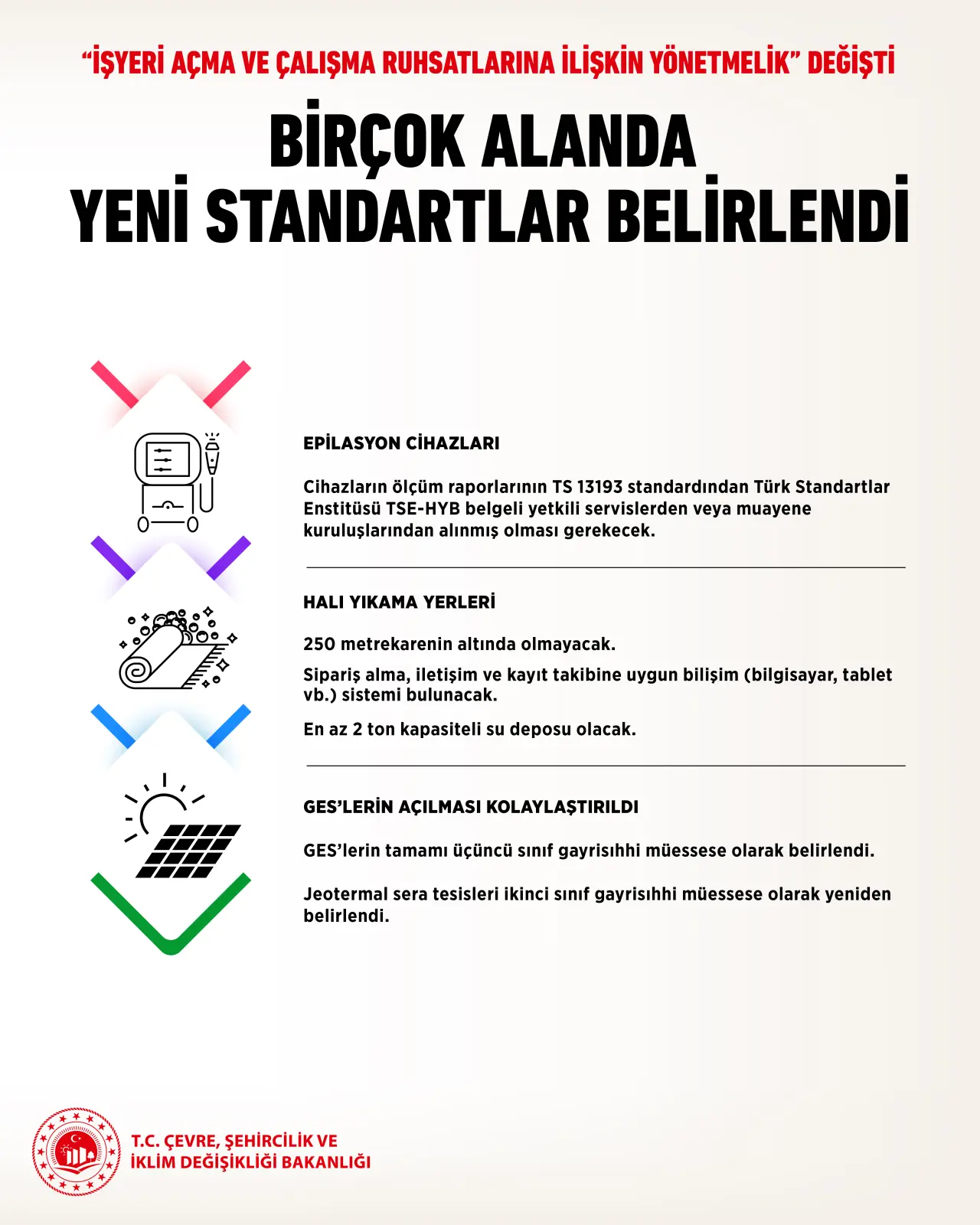 Güneş enerji santrallerinde birinci, ikinci ve üçüncü sınıf gayrisıhhi müessese ruhsatlandırması sınıf tespiti kaldırıldı ve faaliyetin niteliği dikkate alınarak ruhsatlandırmayı kolaylaştırmak, santralleri yaygınlaştırmak ve üretimi artırmak amacıyla GES’lerin tamamı üçüncü sınıf gayrisıhhi müessese olarak belirlendi. Birinci sınıf gayrisıhhi müessese kapsamındaki jeotermal sera tesislerinin sınıfı ruhsatlandırmayı kolaylaştırmak ve üretime katkı sağlamak amacıyla ikinci sınıf gayrisıhhi müessese olarak yeniden belirlendi.