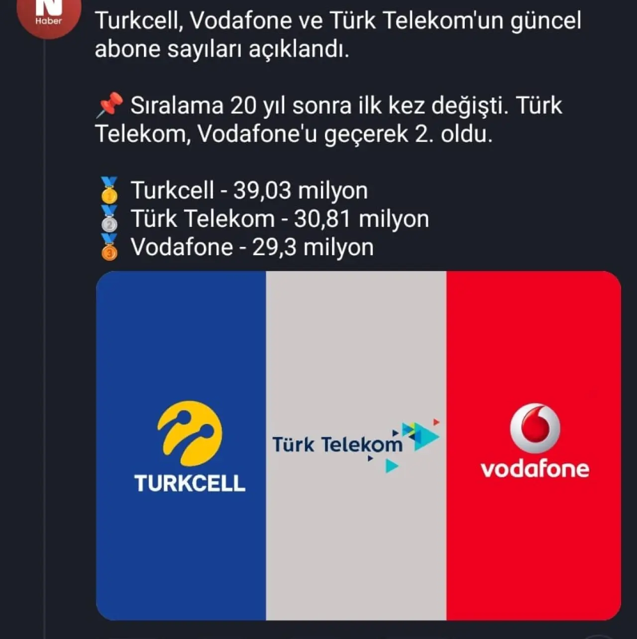Açıklanan rakamlara göre Turkcell, 39,03 milyon aboneyle liderliğini korumaya devam etti. Türk Telekom ise 30,81 milyon aboneye ulaşarak ikinci sıraya yükseldi. Vodafone’un abone sayısı ise 29,3 milyon olarak açıklandı ve şirket üçüncü sıraya geriledi.