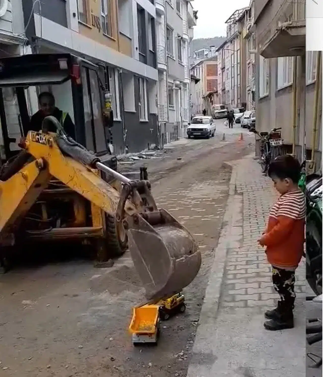 Tokat Belediyesi Fen İşleri Müdürlüğünde iş makinesi operatörü olarak görev yapan Mustafa Uçar, Soğukpınar Mahallesi’nde yürütülen parke taşı tamirat çalışmaları sırasında yürekleri ısıtan bir davranış sergiledi. Çalışmalar esnasında sokakta oyun oynayan 5 yaşındaki Mustafa Tanrıeverdi, oyuncak iş makinesi ve kamyonunu alarak kazıcı yükleyicinin yanına geldi.
