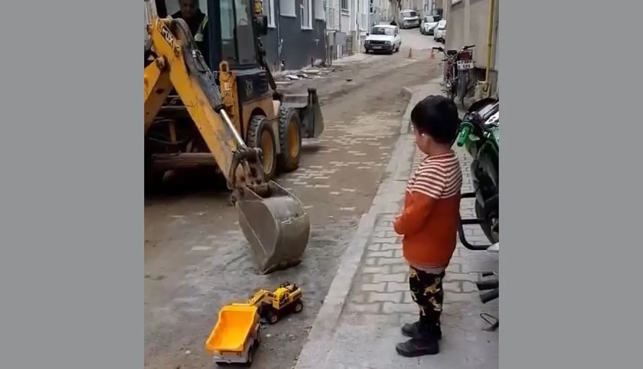 Çalışmaları ilgiyle izleyen minik Mustafa, bir süre sonra operatör Uçar’dan oyuncak kamyonuna da hafriyat dökmesini istedi. Küçük çocuğun isteğini geri çevirmeyen Mustafa Uçar, durumu amirlerine bildirerek izin aldı. Ardından kazıcı yükleyiciyle minik Mustafa’nın oyuncak kamyonuna hafriyat dökerek çocuğun hayalini gerçeğe dönüştürdü. O anlar, çocuğun ailesi tarafından cep telefonu kamerasıyla kaydedildi.