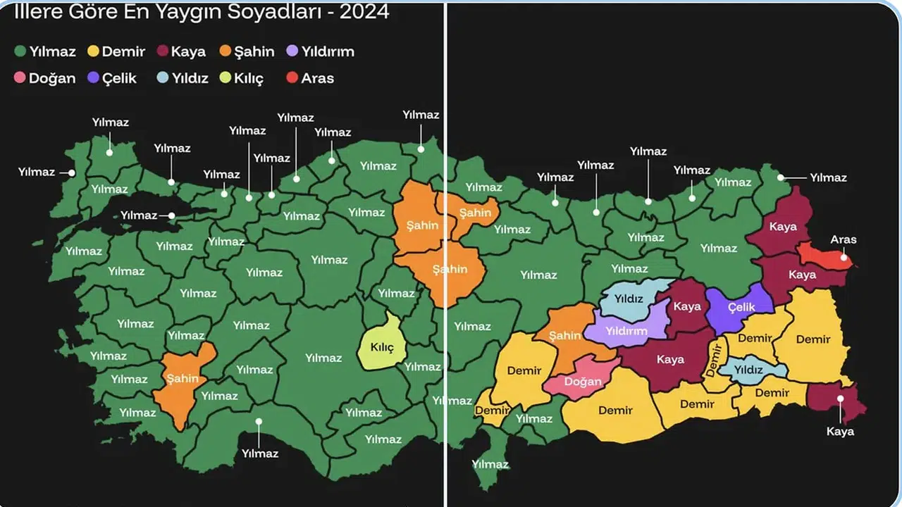 Türkiye İstatistik Kurumu (TÜİK) tarafından yayımlanan Nüfus İstatistikleri Portalı verilerine göre, Türkiye’de en yaygın soyadı “Yılmaz” oldu. Ülke genelinde 1 milyon 174 bini aşkın kişi Yılmaz soyadını taşırken, bu soyadı 70’ten fazla ilde en çok kullanılan soyadı olarak kayıtlara geçti.