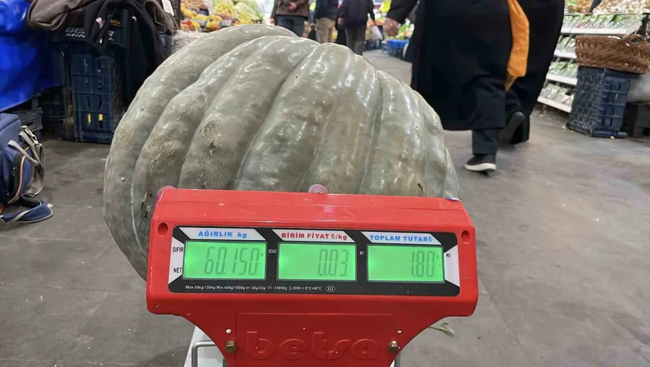 Sivas’ta bir çiftçi, bahçesinde devasa bir bal kabağı yetiştirdi. Bal kabağını satmak için tezgahına getiren esnaf Ferhat Çobanoğlu, gözlerine inanamadı. Ele avuca sığmayan bal kabağını el arabası ile tezgaha taşıyan Çobanoğlu, sergilemeye başladı. 60 kilogram ağırlığındaki bal kabağını ilk kez gören vatandaşlar, dönüp tekrar bakıyor. 57 santimetre boyunda ve 180 santimetre çapındaki bal kabağı, kilosu 30 TL’den satışa sunulacak.