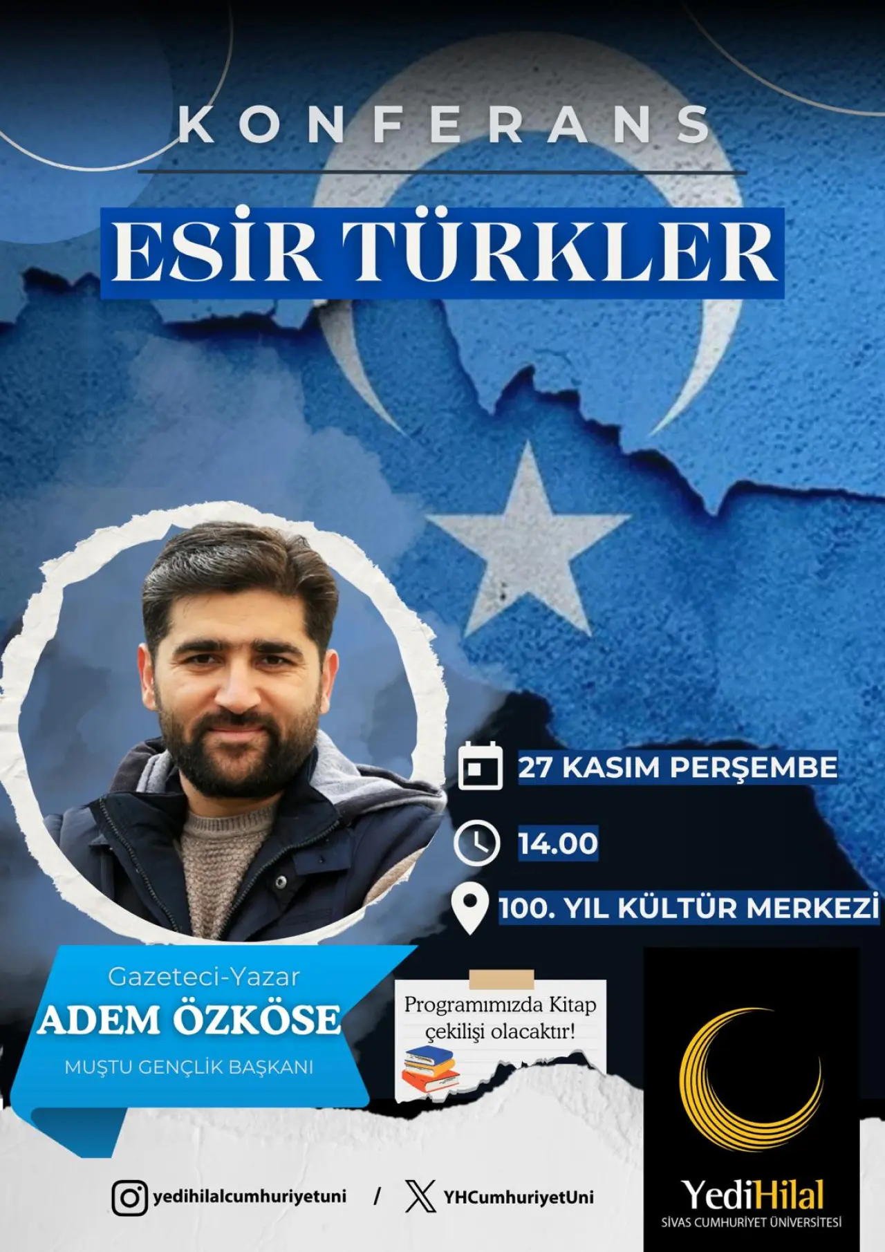 Gazeteci-Yazar ve aynı zamanda Muştu Gençlik Başkanı Adem Özköse, “Esir Türkler” konferansı ile Doğu Türkistan’da yaşanan ağır insanlık ihlallerini, tanıklık ettiği olayları ve bölgedeki gerçekleri tüm yönleriyle katılımcılara aktaracak. Program, 27 Kasım Perşembe, saat 14.00'de Sivas Cumhuriyet Üniversitesi 100. Yıl Kültür Merkezi adresinde gerçekleştirilecek.