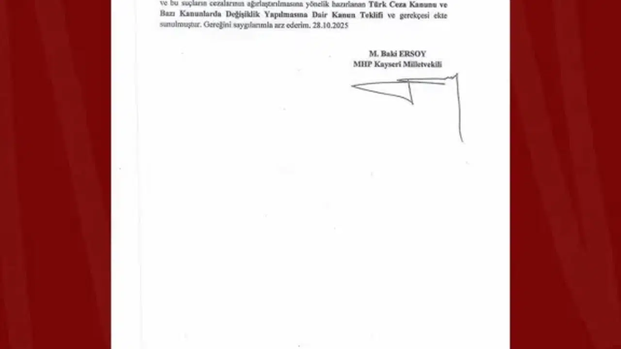 Milliyetçi Hareket Partisi (MHP) Kayseri Milletvekili Baki Ersoy, kadınlara ve çocuklara yönelik işlenen suçlara indirim yapılmamasına dair kanun teklifinde bulundu.