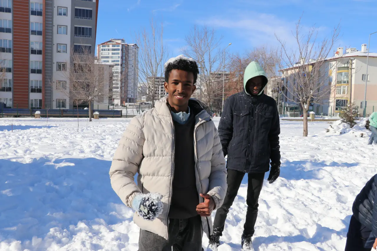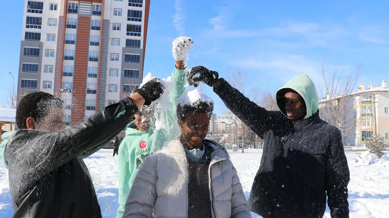 Sivas’ta eğitim gören birçok Afrikalı öğrenci, hayatlarında ilk kez karla tanıştı. Kardan adam yaparak kartopu oynayan öğrenciler doyasıya eğlendi.