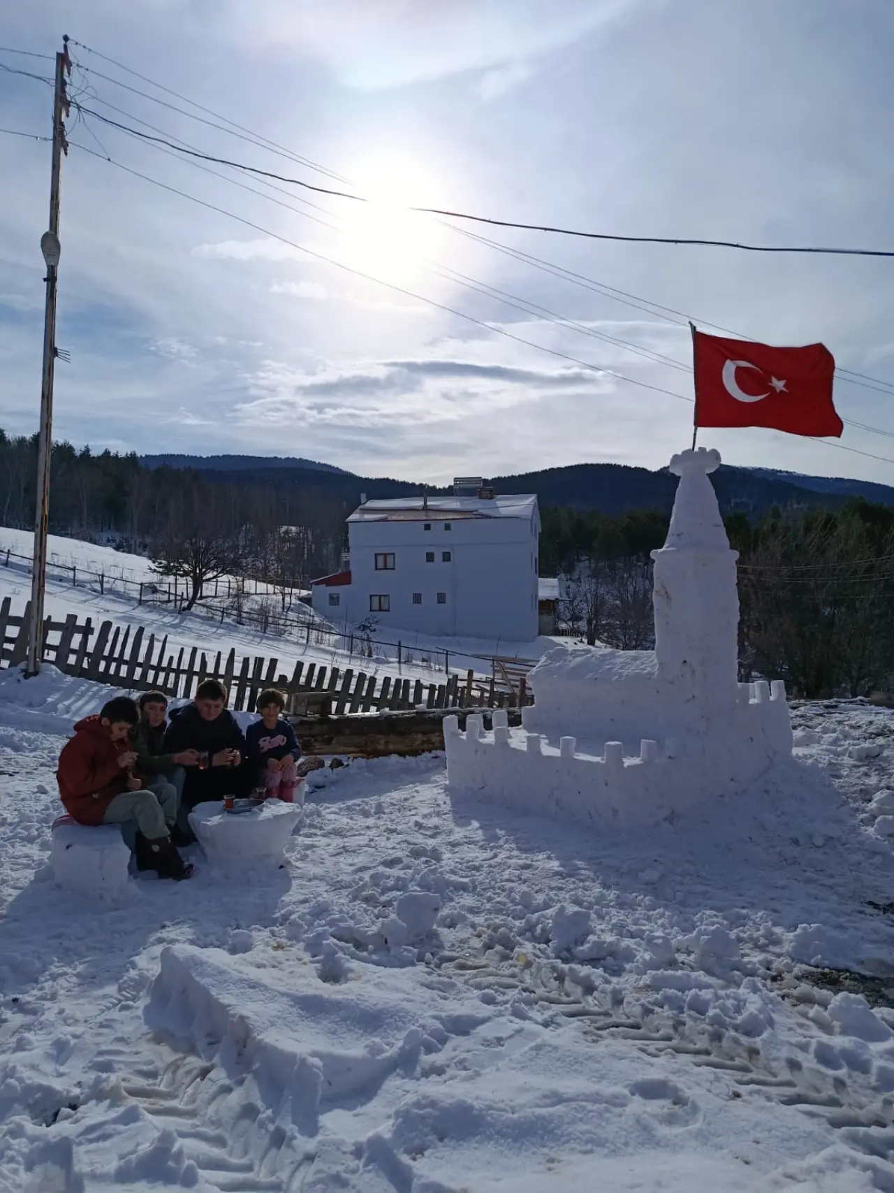 Sivas'ın ücra köyünde Kız kulesi karşısında çay içmek isteyen çocuklar, hayallerini kardan yaptıkları Kız kulesi ile gerçekleştirdi.