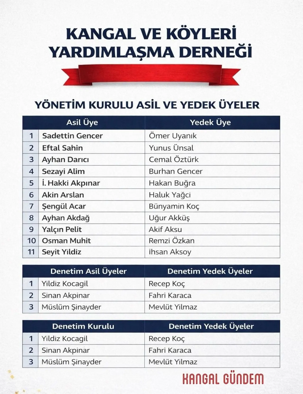 Kangal ve Köyleri Yardımlaşma Derneği, yakın zamanda gerçekleştirdiği genel kurul toplantısı ile yeni dönem yönetimini belirledi. Genel kurulda, derneğin kurucu başkanı Mustafa Buğra, görevini uzun yıllardır dernek yönetiminde çeşitli kademelerde görev alan Sadettin Gencer’e devretti.