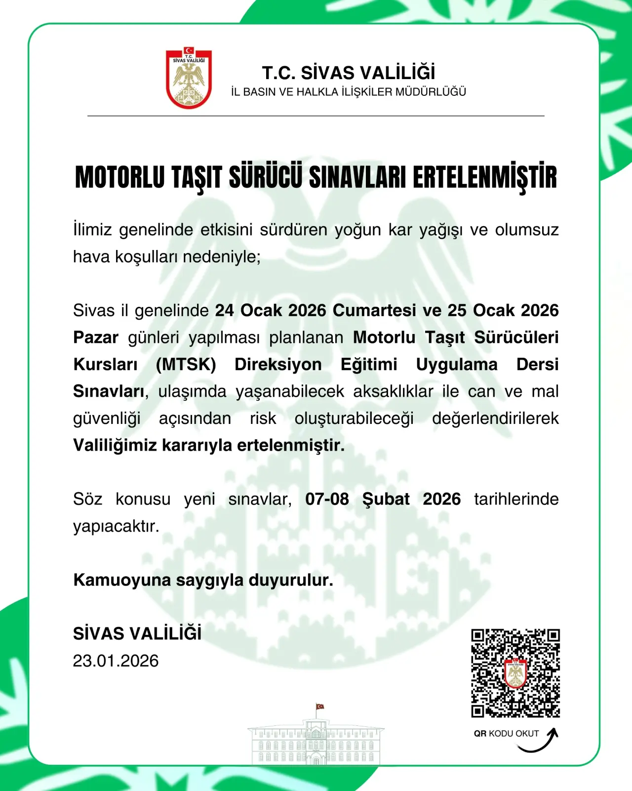 Sivas Valiliği İl Basın ve Halkla İlişkiler Müdürlüğü’nden yapılan açıklamada, il genelinde devam eden olumsuz hava şartlarının ulaşımda aksamalara yol açabileceği ve bu durumun can ve mal güvenliği açısından risk oluşturabileceği değerlendirildiği belirtildi. Bu kapsamda, 24 Ocak 2026 Cumartesi ve 25 Ocak 2026 Pazar günleri yapılması planlanan direksiyon sınavlarının ertelenmesine karar verildi.