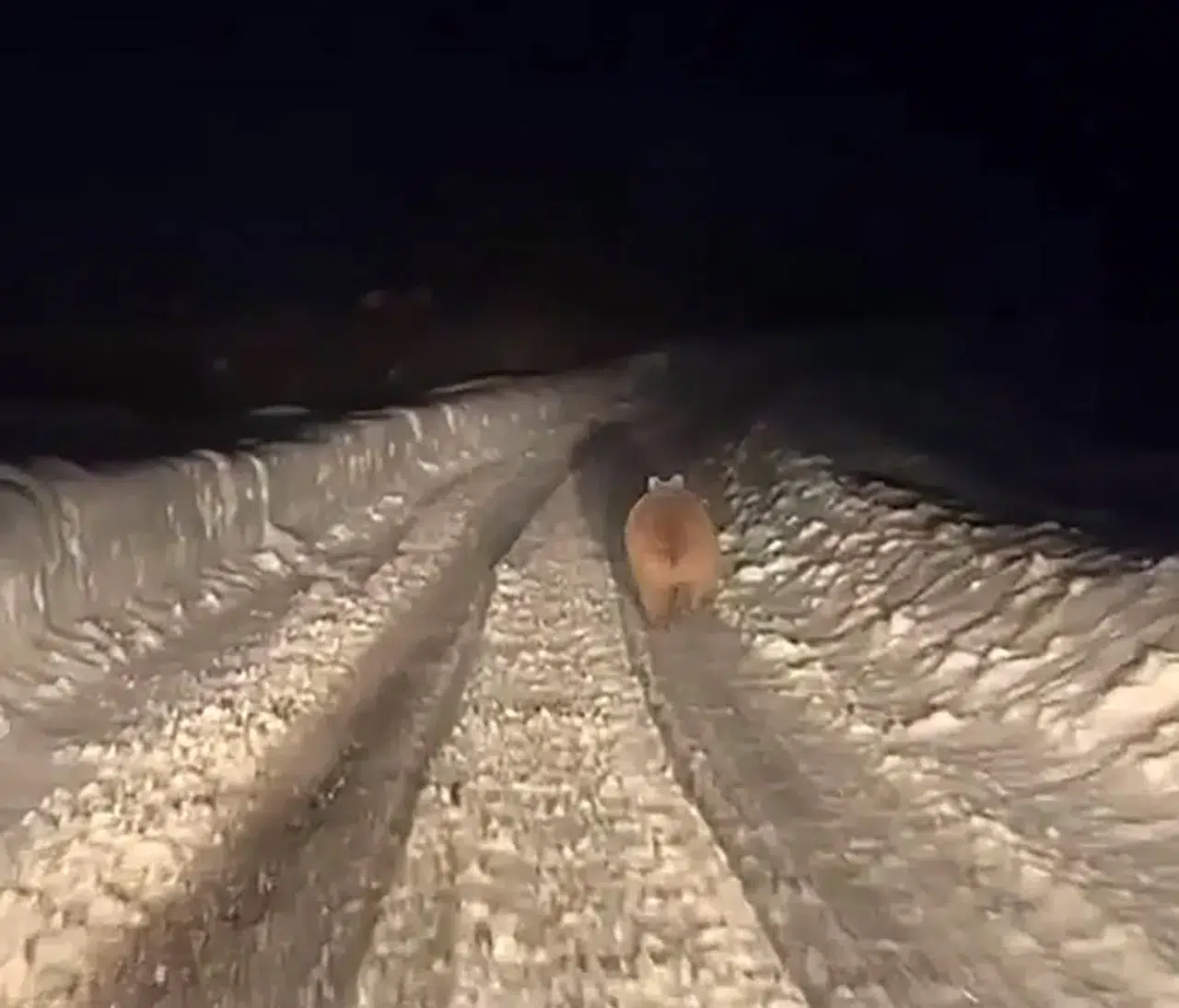 Seyir halindeyken yolun ortasında bir boz ayıyla karşılaşan Pınar, aracını yavaşlatarak ayıyı bir süre takip etti. Aracın önünde koşan ayının aşırı kilolu görüntüsü dikkat çekerken, o anlar cep telefonu kamerasıyla kaydedildi.