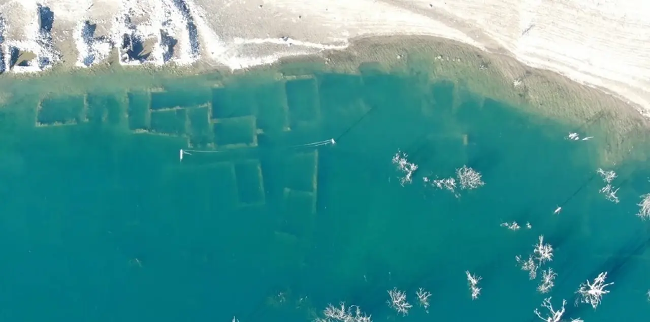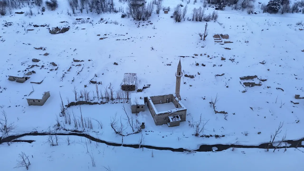 Sivas'ta kuraklık nedeniyle Pusat Barajı'nın suyu çekildi. Suyun azalmasıyla ortaya çıkan eski Pusat köyü, yıllar sonra kar altında kaldı.