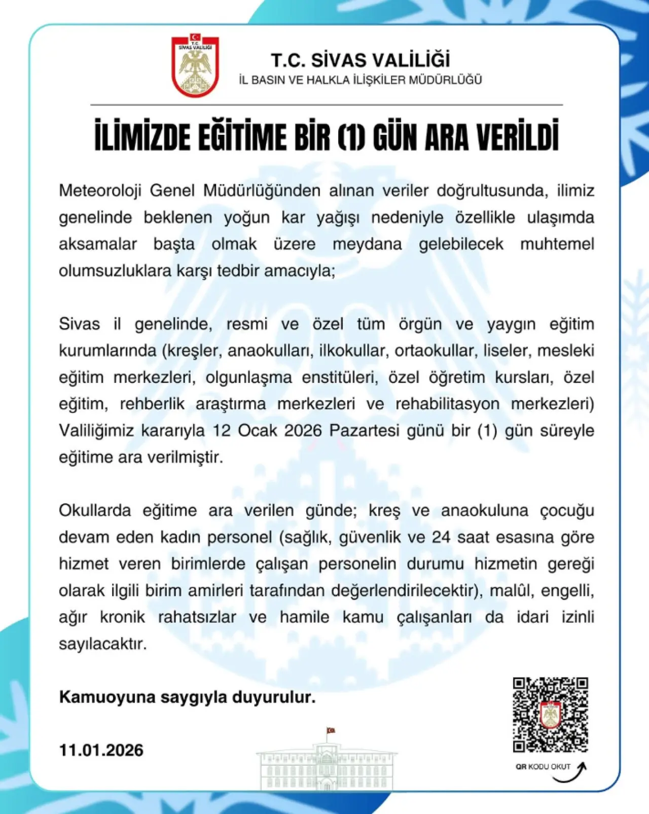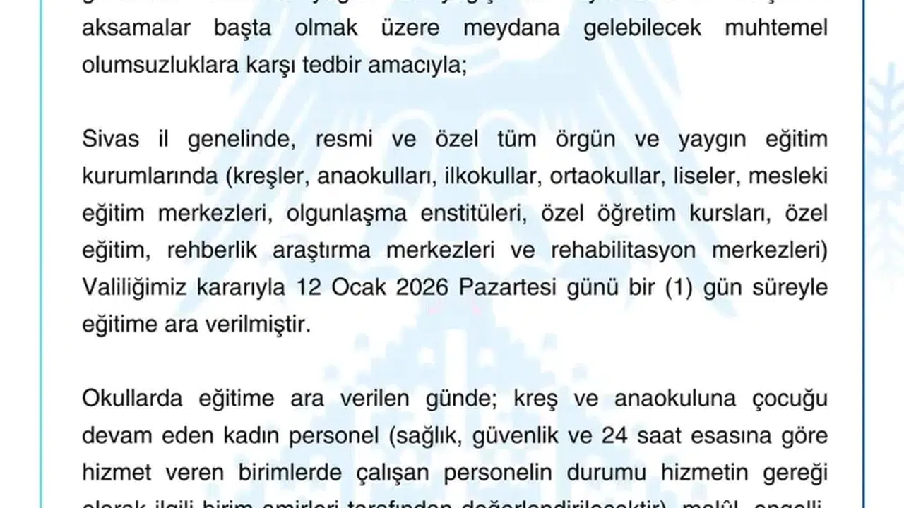 Sivas Valiliği tarafından yapılan açıklamada, il genelinde resmi ve özel tüm örgün ve yaygın eğitim kurumlarında 12 Ocak 2026 Pazartesi günü eğitim-öğretime ara verildiği duyuruldu.