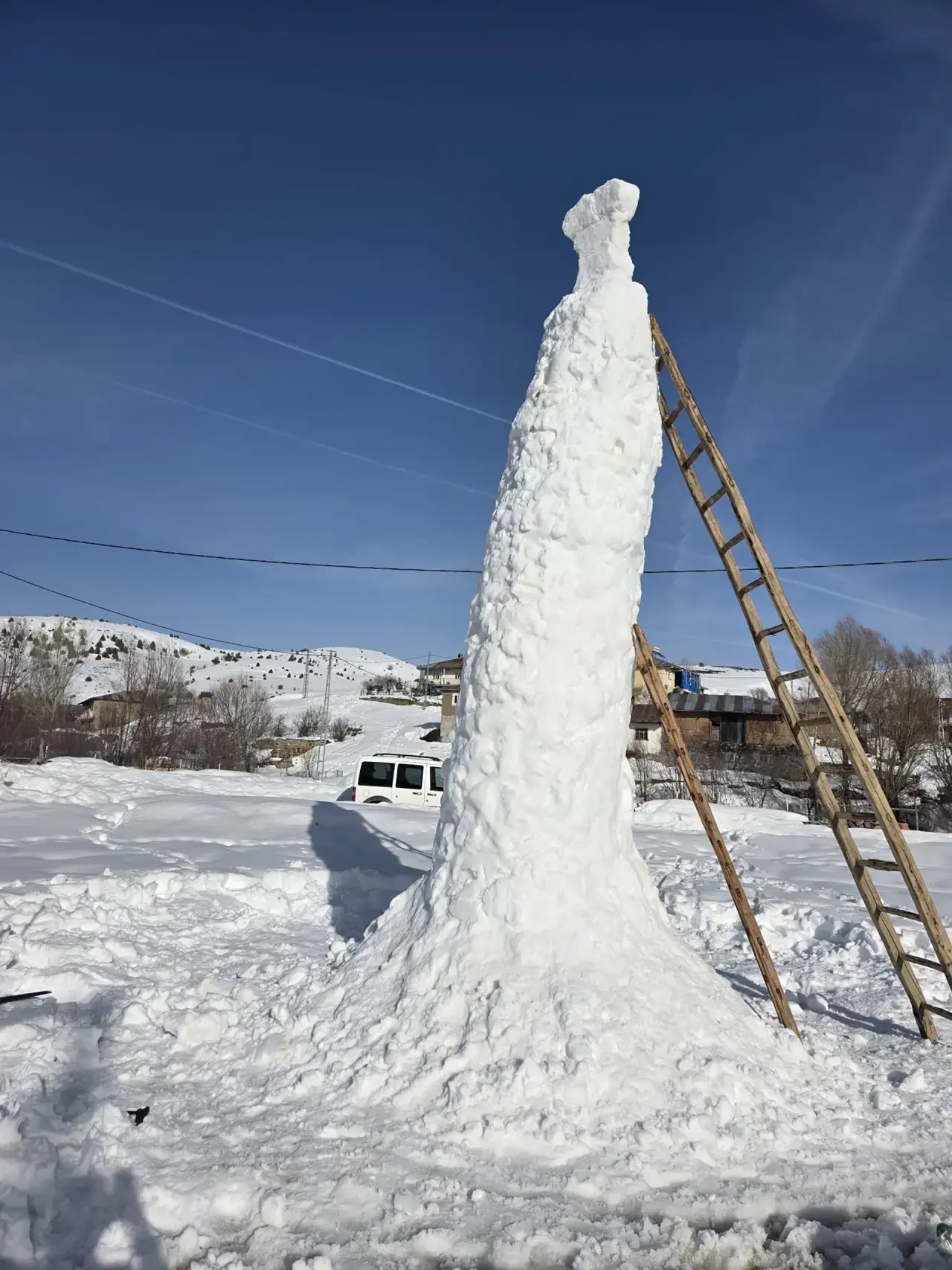 Günlerdir etkili olan kar yağışının ardından beyaza bürünen köyde ortaya çıkan dev kardan adam, görenlerin ilgisini çekti. Köy halkı ve çocuklar yapılan kardan adamın etrafında hatıra fotoğrafı çektirirken, ortaya çıkan görüntüler renkli anlara sahne oldu.