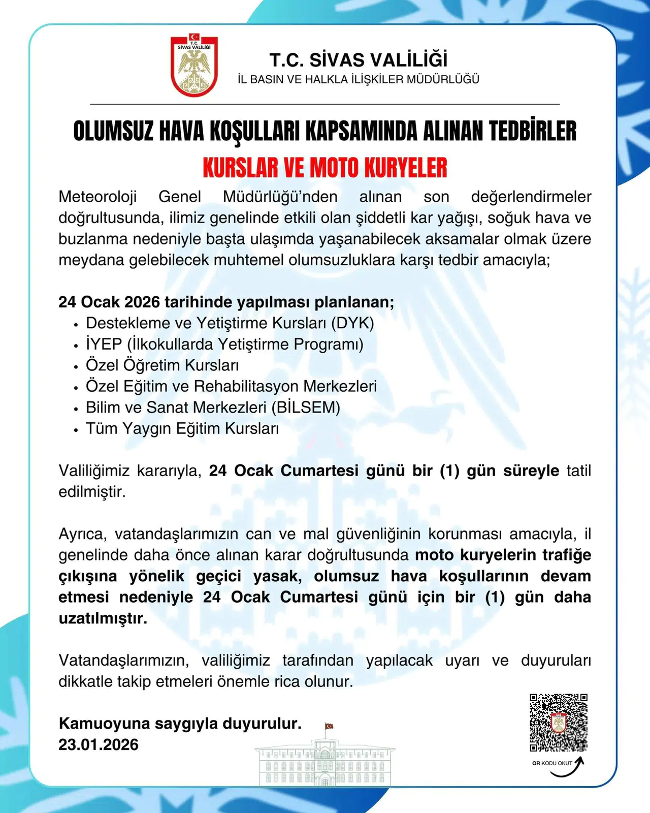 T.C. Sivas Valiliği İl Basın ve Halkla İlişkiler Müdürlüğü tarafından yapılan açıklamaya göre, 24 Ocak 2026 Cumartesi günü il genelinde yapılması planlanan Destekleme ve Yetiştirme Kursları (DYK), İlkokullarda Yetiştirme Programı (İYEP), özel öğretim kursları, özel eğitim ve rehabilitasyon merkezleri, Bilim ve Sanat Merkezleri (BİLSEM) ile tüm yaygın eğitim kursları bir gün süreyle tatil edildi.
