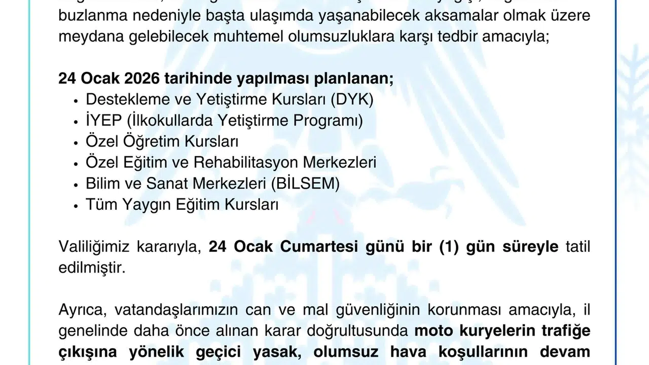 Öte yandan, daha önce alınan karar doğrultusunda moto kuryelerin trafiğe çıkışına yönelik geçici yasak, olumsuz hava koşullarının devam etmesi nedeniyle 24 Ocak Cumartesi günü için bir gün daha uzatıldı. Valilik, bu kararın da sürücülerin ve vatandaşların can ve mal güvenliğini sağlamak amacıyla alındığını duyurdu.