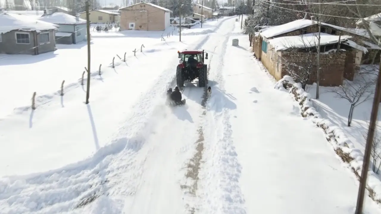 Sivas’ta etkili olan yoğun kar yağışı, bazı vatandaşlar için eğlenceli anlara sahne oldu. Kent merkezine 37 kilometre uzaklıktaki Akpınar köyünde yaşayan Ali Çelik, traktörüne bağladığı lastikle köy sokaklarında kayarak karın keyfini çıkardı.