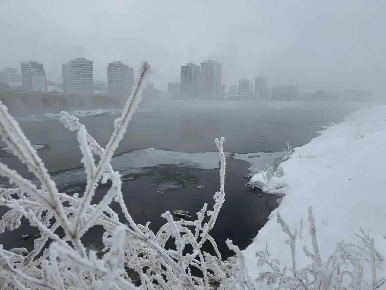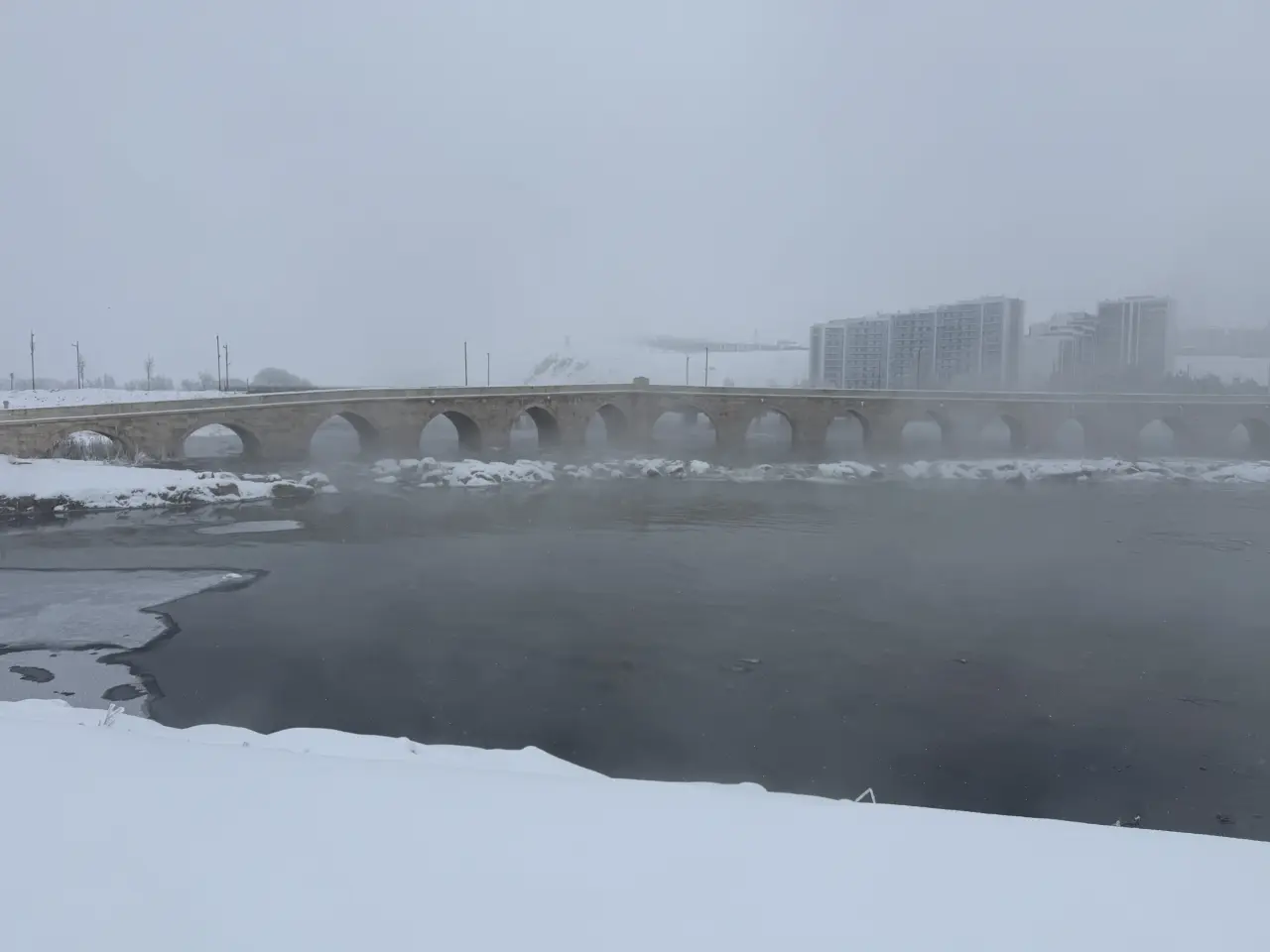 Nehrin şehirden geçen bazı bölümleri kısmen donarken suda yaşayan canlılar donmamış alanlarda avlandı.