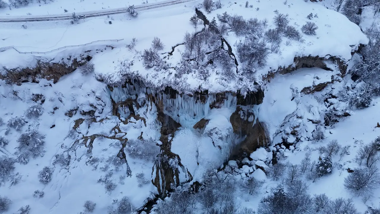 İlkbahar aylarında yeşile bürünen, yaz aylarında ferahlatan suyu ile ün salan Dipsizgöl Şelalesi, sonbahar ve kış aylarında da farklı bir güzelliğe bürünüyor. Çevredeki su ve ağaç zenginliği nedeniyle Karadeniz Bölgesi’ni benzetilen alan, bölgede etkili olan kar ile birlikte resim tablolarına benzetiliyor. Dipsizgöl’den akan suyun kayalıklardan dökülmesiyle oluşan Dipsizgöl Şelalesi, soğuk havanın etkisiyle dondu. Yaklaşık 50 metre yükseklikten dökülen suyun donmasıyla birlikte devasa buz sakıtları oluştu. Buz sarkıtlarının boyu 5 metreye kadar ulaşırken şelale sessizliğe büründü. Sivas’ın önemli turistik doğal güzellikleri, dron ile havadan görüntülendi.