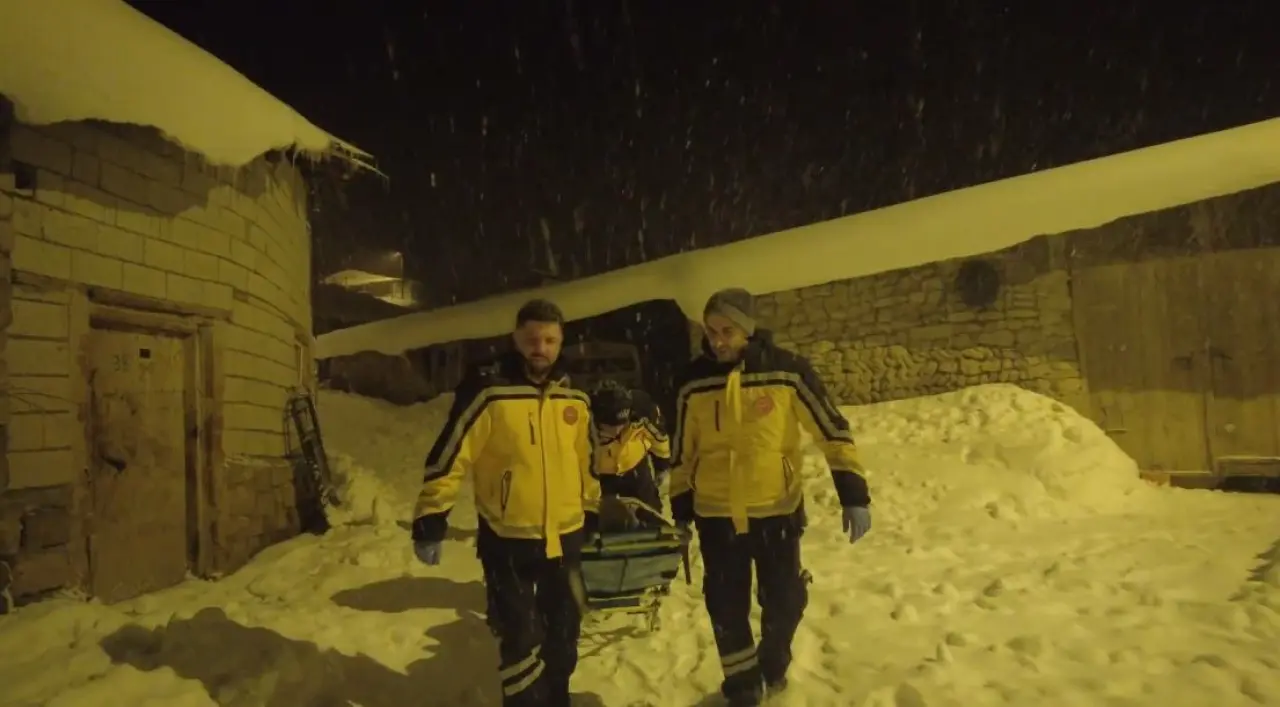 Sivas'ta yoğun kar yağışı nedeniyle yolu kapanan köye rahatsızlanan kadın hasta için ekipler seferber oldu.