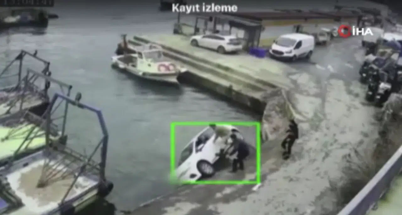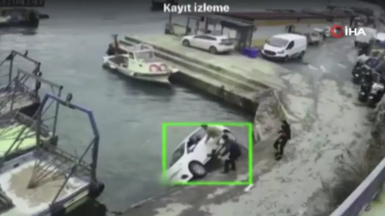 Otomobilin denize düştüğü o anlar ise güvenlik kamerasına yansıdı. Görüntülerde seyir halindeki otomobilin denize düştüğü ve çevredekilerin denize düşen araca yardıma koştuğu, denizdeki balıkçı teknesindeki bir kişinin ise denize atlayarak yardıma geldiği görülüyor.