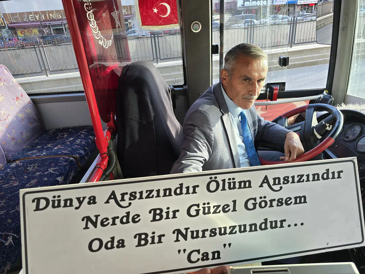 Yozgat Özel Halk Otobüsü şoförü Mehmet Uzun, nezaketli davranışları, manileri ve otobüs yazılarıyla görenlerin beğenisini topluyor.